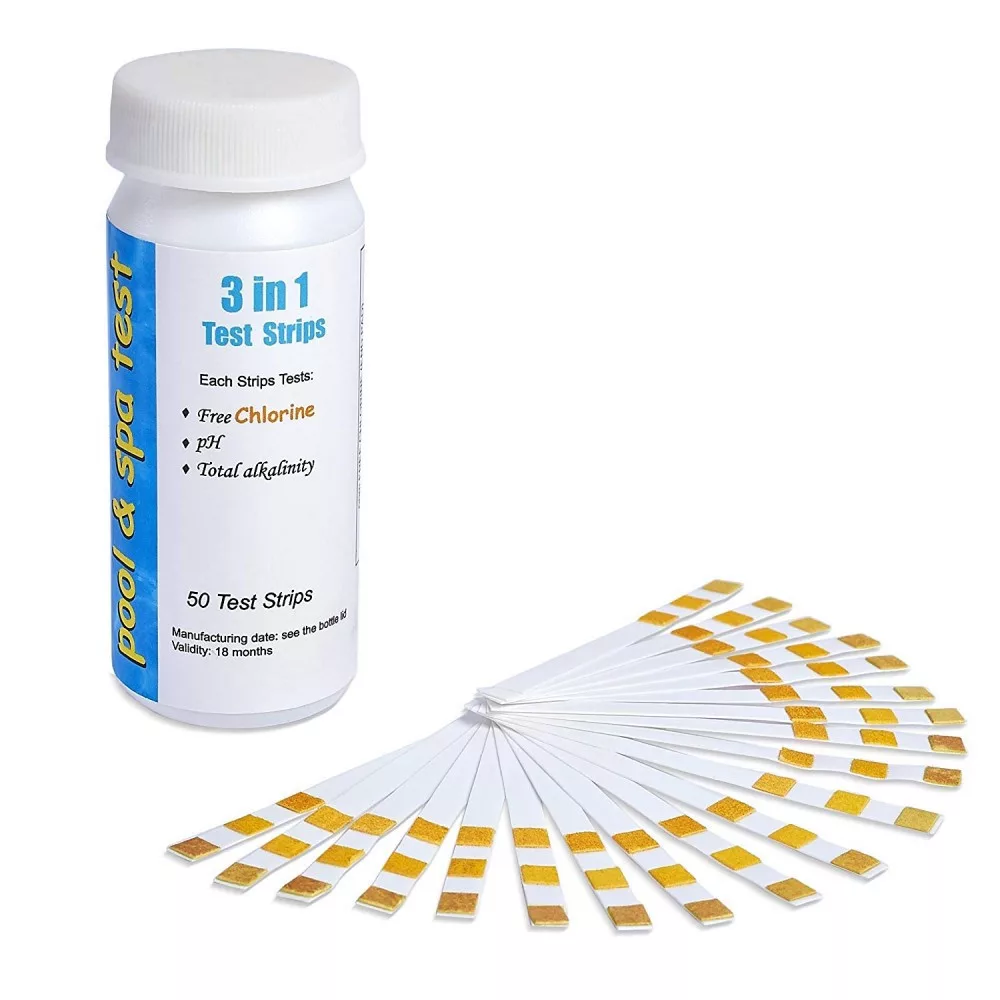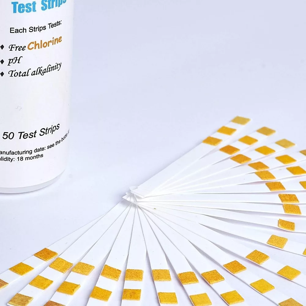 Mérőcsík készlet 50 darabos csomagban, szabad klór, lúgosság és pH mérésére.