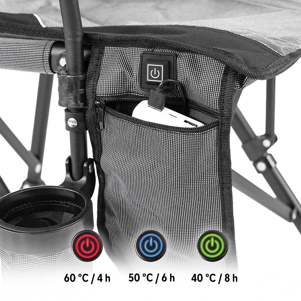 A fűthető horgásszék működtetése egyszerű és praktikus: hosszú nyomásra bekapcsol, majd minden egyes gombnyomás fokozatváltást eredményez, a ciklus végén pedig kikapcsol. Három különböző fűtési szint választható: – 60 °C (kb. 4 óra), 50 °C (kb. 6 óra) és 40 °C (kb. 8 óra).