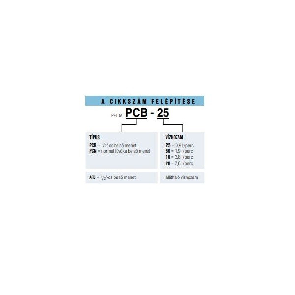 A négyféle PCB típusból a színjelölés révén könnyen kiválaszthatja azt a fejet, amelyik éppen annyi vizet juttat ki, amennyire a növénynek szüksége van. A kiöntözött vízmennyiség pontosan 0,9, 1,9, 3,8 vagy 7,6 l/perc, így nem kell becslésre hagyatkoznia. Alkalmazható a 7,6 l/percig állítható vízmennyiségű AFB nyomáskiegyenlített fej is, a vízmennyiség finoman állítható a fej rozsdamentes acélcsavarjával.