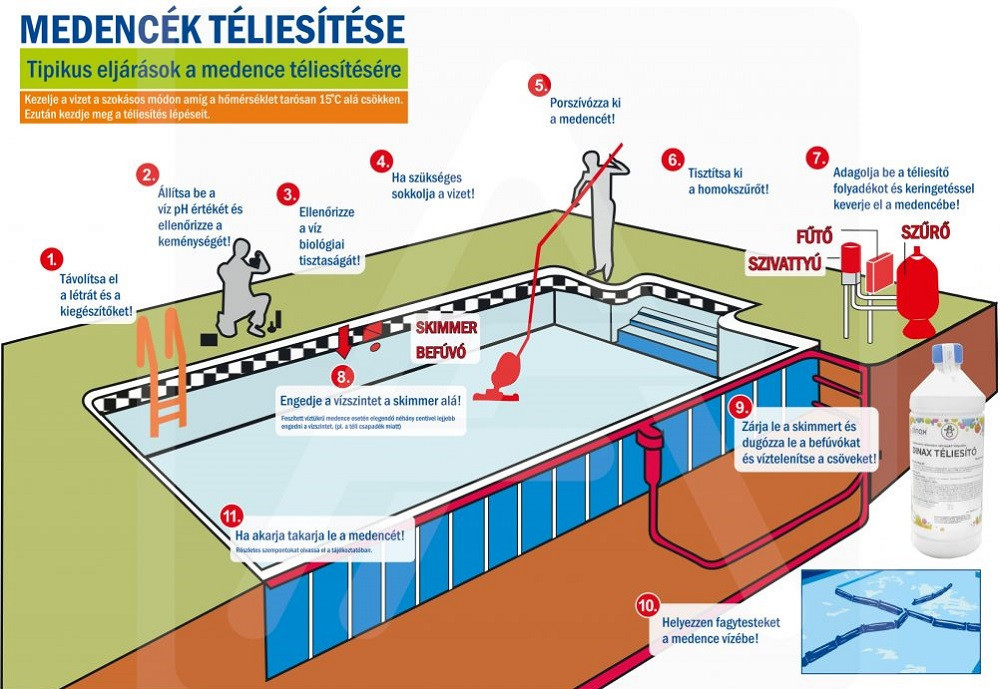 -Csak tiszta, megfelelő fertőtlenítőszer tartalmú (klór esetében 0,6-1 mg/l szabad aktív klór koncentráció), biológiailag jó állapotban lévő vízzel szabad a medencét téliesíteni. Amennyiben fertőtlenítőszer tartalma, és a víz általános higéniai állapota megfelelő, a téliesítőszer a címkén lévő adagolási útmutató szerint beadagolható.