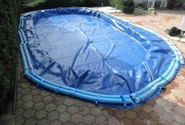 A takaró fólia túlnyúlik a medence peremén, a vízzsákokat a medence köré, a fólia szélére kell helyezni.