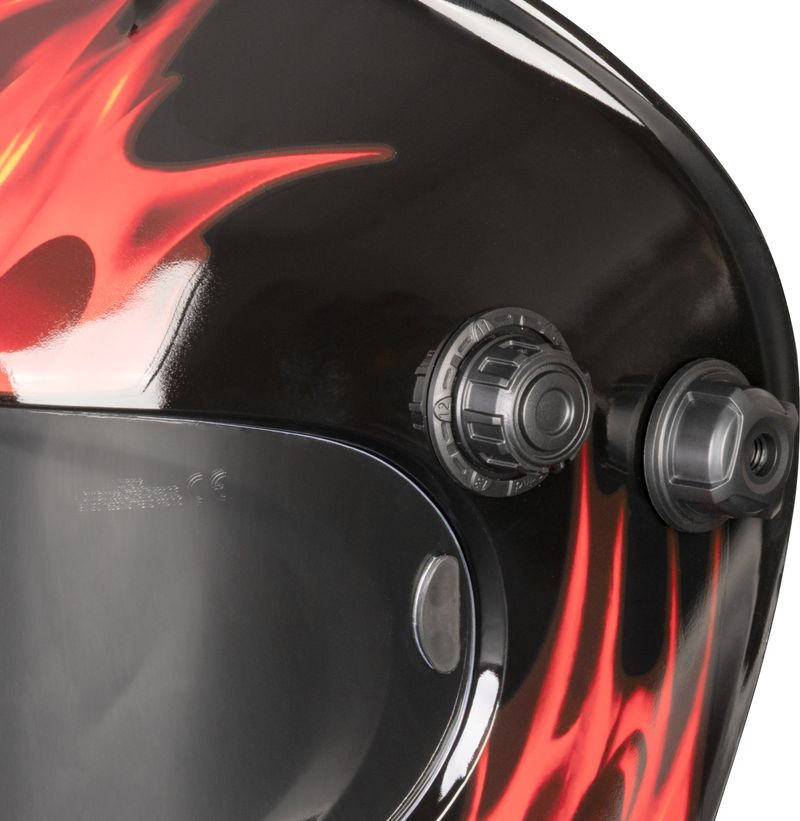 Érezd a teljes védelem biztonságát a Strend Pro Galaxy Flame automata sötétedésű hegesztőpajzzsal! A látványos fekete alapon vörös lángmintás sisak az AutoDark szűrőnek köszönhetően milliszekundumok alatt DIN 4-ről akár DIN 13-ig elsötétül, így megóvja szemedet a hegesztési ív káros sugárzásától. 110 × 90 mm-es kazetta, 92,5 × 42,5 mm-es látómező és mindössze 0,92 kg tömeg biztosítja, hogy hosszú műszakok alatt se terhelje nyakadat.