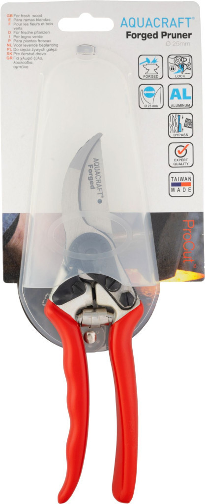 Élvezd a precíz, erőkímélő metszést az AQUACRAFT® 330550 kovácsolt kerti ágvágó ollóval! A kovácsolt alumínium test és a SK-5 acélból készült, precíziósan csiszolt penge tiszta, sima vágást garantál akár vastagabb gallyaknál is. A piros, ergonomikus markolat csúszásmentes bevonata kényelmes fogást ad, a beépített biztonsági zár pedig megóv a véletlen nyitástól. A mellékelt övtáska révén mindig kéznél tarthatod ezt a mindössze 0,35 kg-os, profi szerszámot.