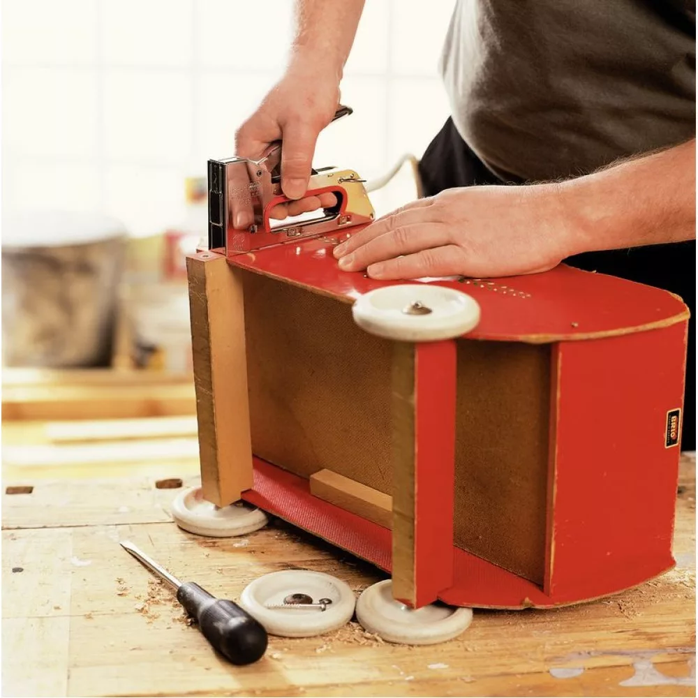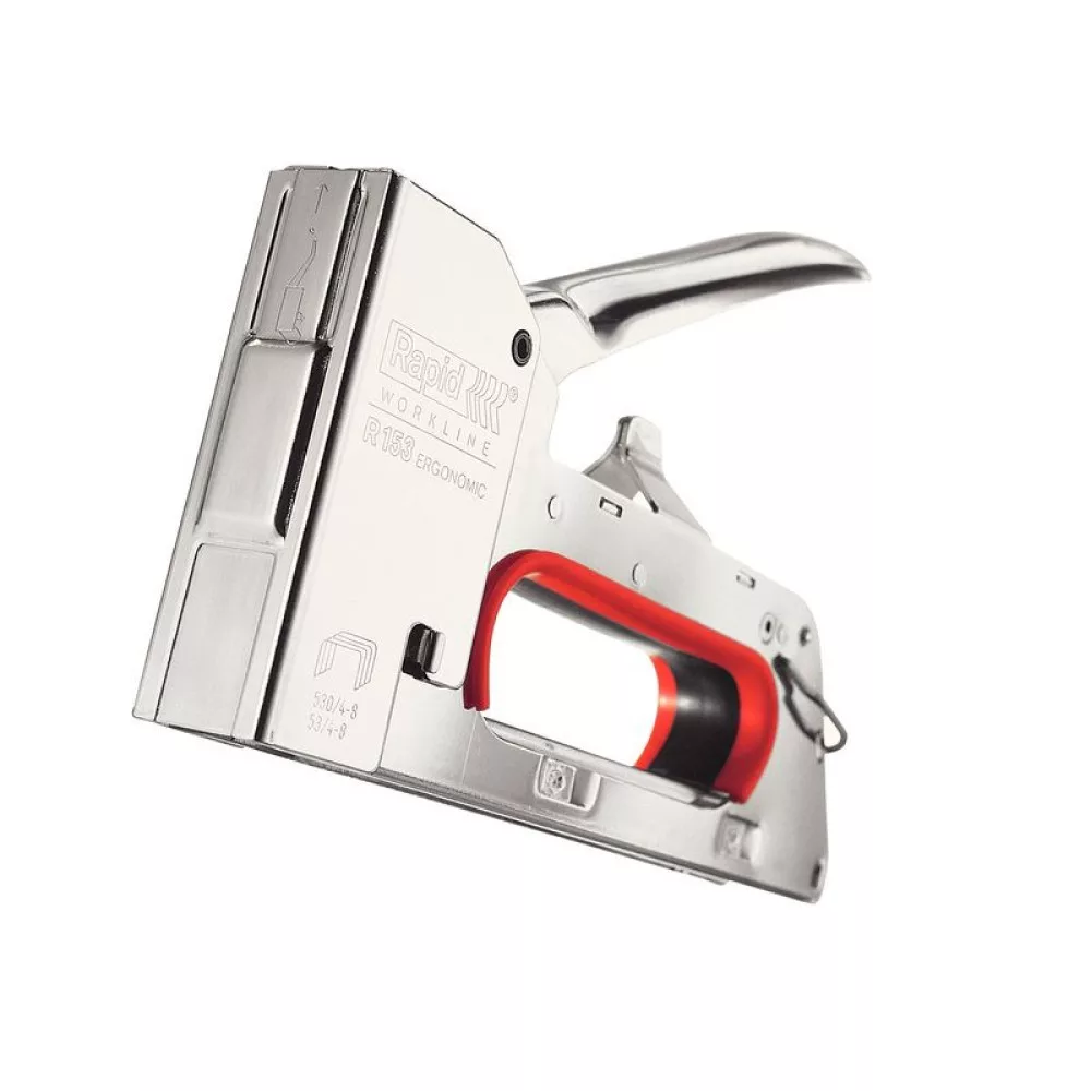 Robusztus fémtestével és erőteljes ütőerejével a RAPID R153 kézi kárpitos tűzőgép ideális társ, ha fához vagy más kemény felülethez kell textilt, fóliát, bőrt rögzítened. A klasszikus 53-as típusú finomhuzalú kapcsokat fogadja 4–8 mm-es hosszban, így pontos, tiszta illesztést biztosít kárpitozáshoz, dekorációhoz vagy barkácsmunkához. Ergonomikus, piros betétes markolata kényelmes fogást ad, a praktikus zárral pedig biztonságosan összezárhatod a szerszámot szállításkor.