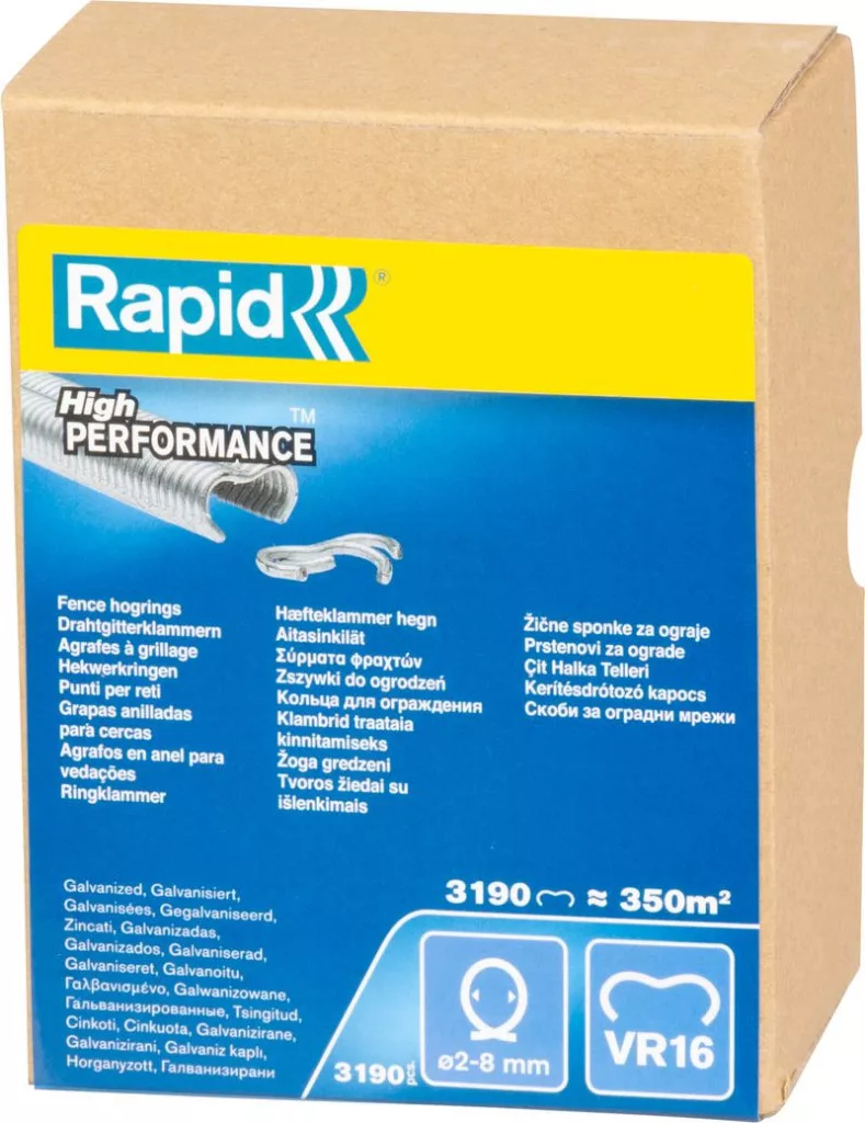 Az erős horganyzott acél gyors és egyenletes kötést ad, ezért a munka rövidebb idő alatt elkészül, kevesebb utómunkát igényelve. A pontos VR16 méret tökéletesen illeszkedik a Rapid FP216 és FP20 fogók tárjába, így akadásmentes adagolást tesz lehetővé, megelőzve a felesleges leállásokat kerítésépítés közben.