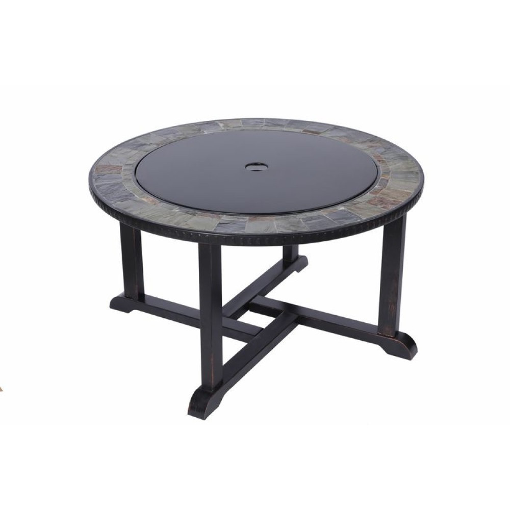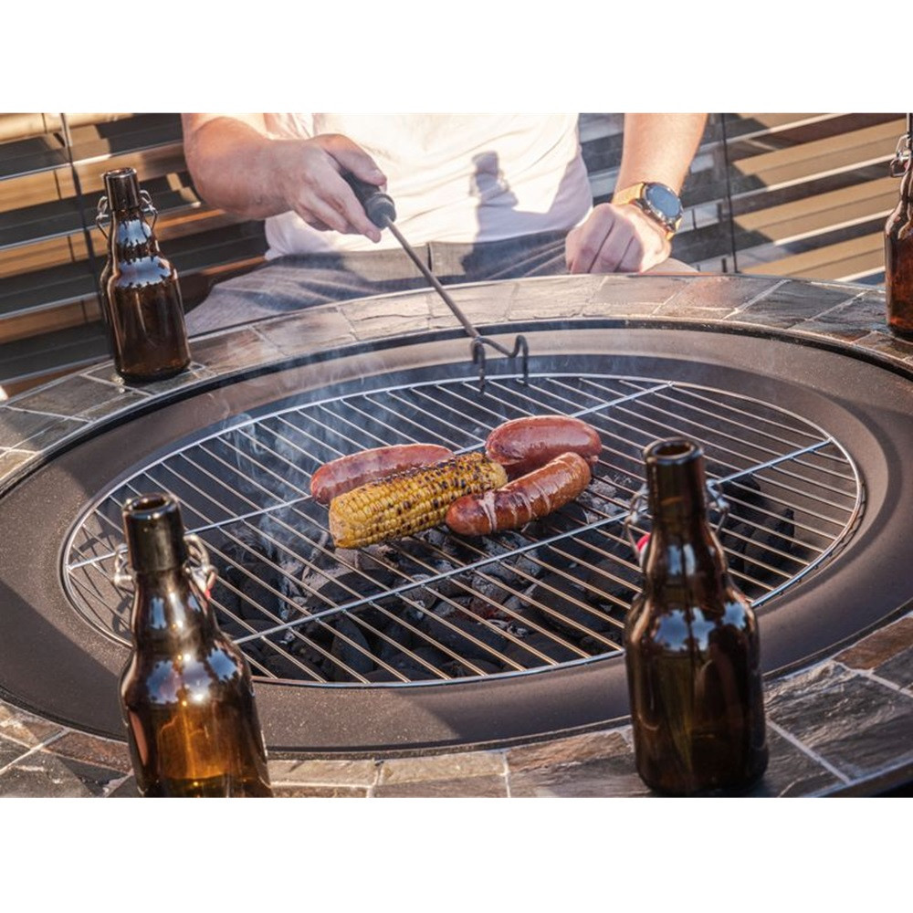 A mediterrán stílusú, fém szerkezetű tűzrakóhely stabil és tartós kialakítású. A 58 cm átmérőjű grillrács elegendő helyet biztosít a grillezéshez, miközben a dekoratív oldalsó csempézett felület praktikus tároló- vagy lerakóhelyként is szolgál. A készlethez tartozó ponyvával a tűzrakóhely teljes értékű asztallá alakítható.