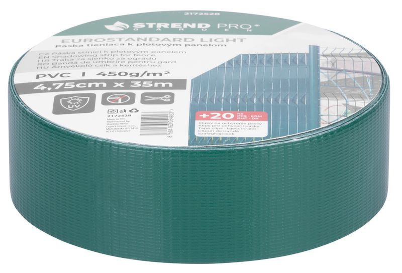 A Strend Pro EUROSTANDARD LIGHT árnyékoló szalag 4,75 cm magas, 35 m hosszú tekercsben érkezik, hogy egyszerűen befűzhesd a kerítéspanelek függőleges rácsozatába. A 450 g/m² sűrűségű, UV-stabil PVC szalag erős védelmet nyújt a napfény, a kíváncsi tekintetek és a szél ellen, miközben elegáns, egységes zöld felületet ad kertednek. A mellékelt 20 db klipsz gyors telepítést tesz lehetővé, így percek alatt privát és rendezett környezetet teremthetsz.