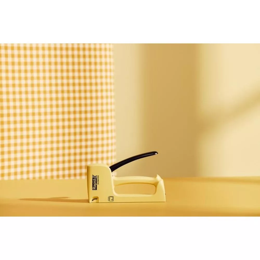 Élvezd a professzionális rögzítés szabadságát a RAPID Spirit of Sweden Blomster R53 kézi tűzőgéppel! A 90%-ban újrahasznosított, régi hűtőkből nyert műanyag ház nemcsak bolygóbarát, hanem rendkívül strapabíró is. Könnyű, mindössze 0,3 kg-os súlya és ergonomikus, fekete karja révén hosszabb munkák során sem fárasztó. A sárga, „blomster” árnyalat stílusos megjelenést kölcsönöz, a 4–10 mm hosszú, 53-as kapcsok pedig pontos, tiszta rögzítést garantálnak textilekhez, bőrhöz vagy poszterhez.