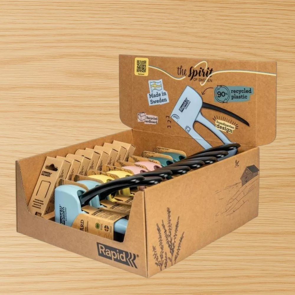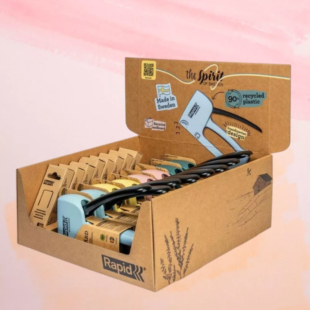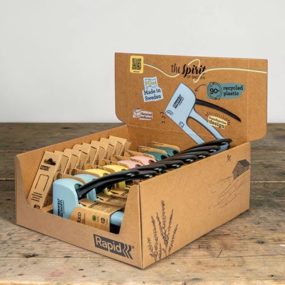 Szabadítsd fel a kreativitásod a RAPID Spirit of Sweden R13 kézi tűzőgépkészlettel! A svédországi Hestrában gyártott eszköz 90 %-ban újrahasznosított műanyagból készült, így a precíz, tartós működés mellett a fenntarthatóságot is szolgálja. A 13 típusú kapcsok 4–10 mm-es hosszban gondoskodnak a biztos rögzítésről, legyen szó kárpitozásról, poszterek rögzítéséről vagy bőr javításáról. A dobozban 8 változatos pasztellszínű tűzőgépet és 8 csomag kapcsot találsz, így rögtön indulhat a munka.