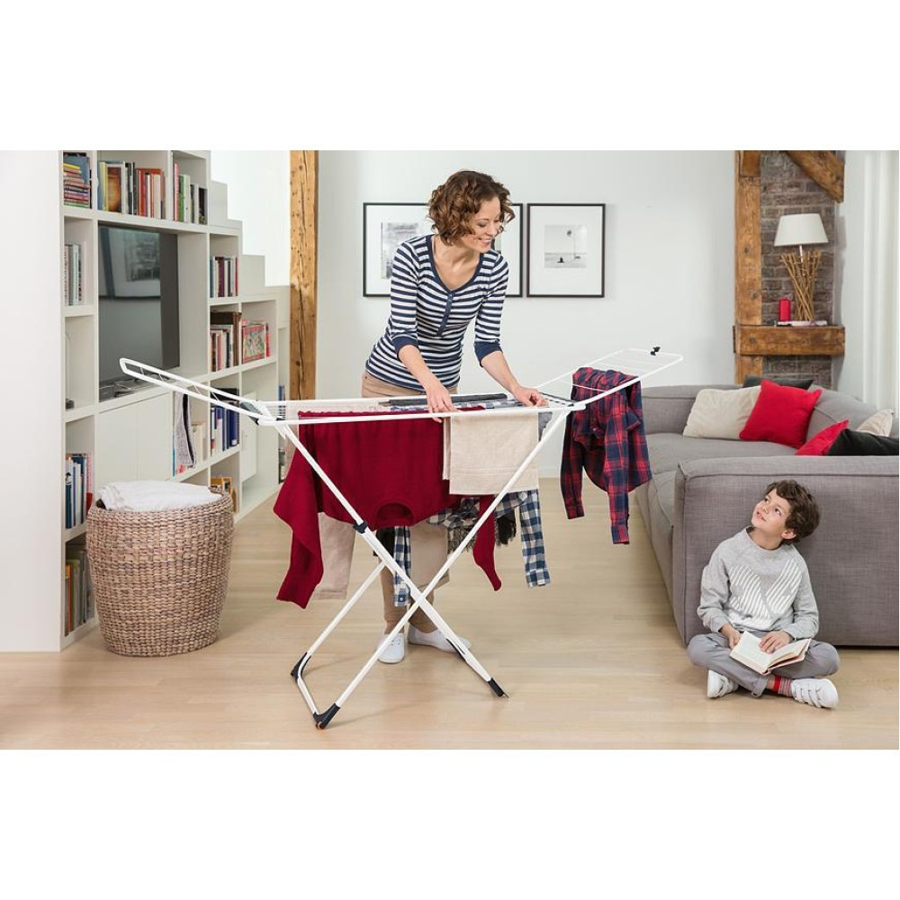 A 18 méteres szárítási terület bőven elegendő a mindennapi mosásokhoz. Az acél vázszerkezet biztosítja a hosszú élettartamot és a stabil használatot, miközben a szárnyak kinyithatók extra szárítófelület érdekében. Összecsukva rendkívül keskeny, így könnyedén elfér akár a szekrény mögött is. Egyszerre praktikus, kompakt és megbízható megoldás, ha helytakarékosan szeretnél ruhát szárítani.