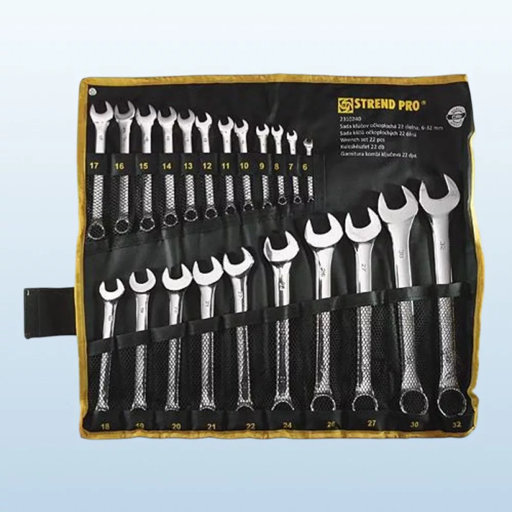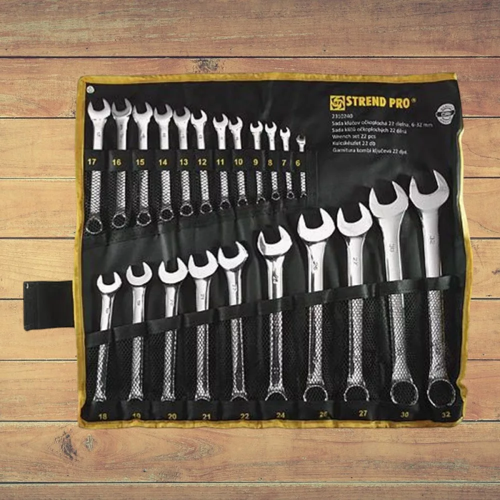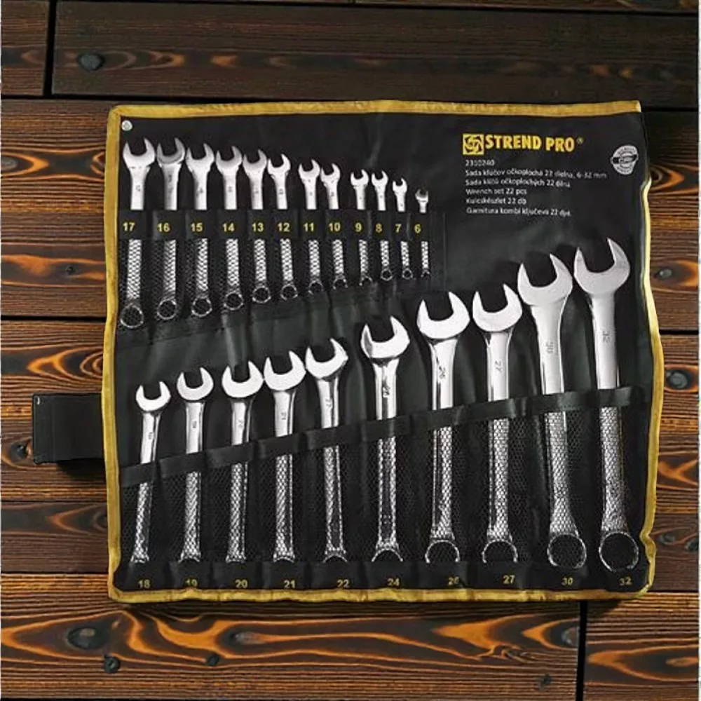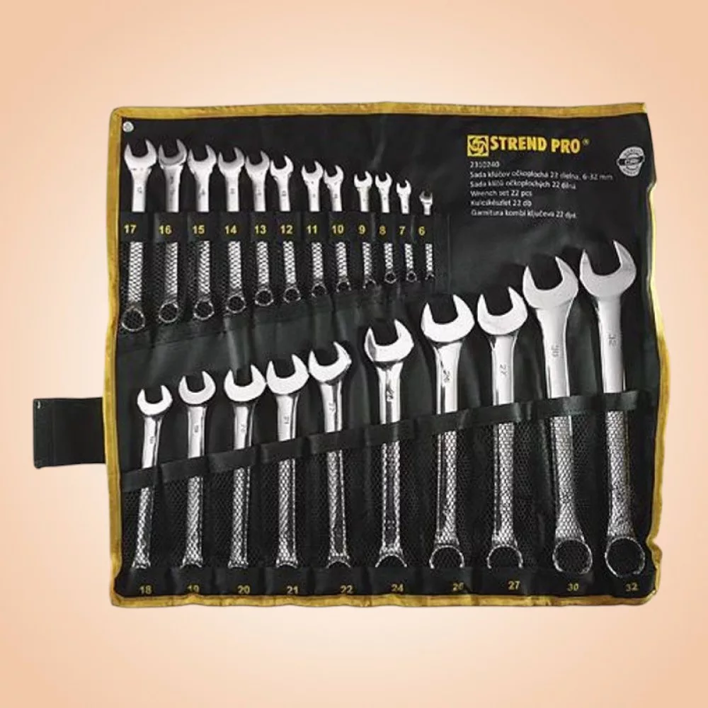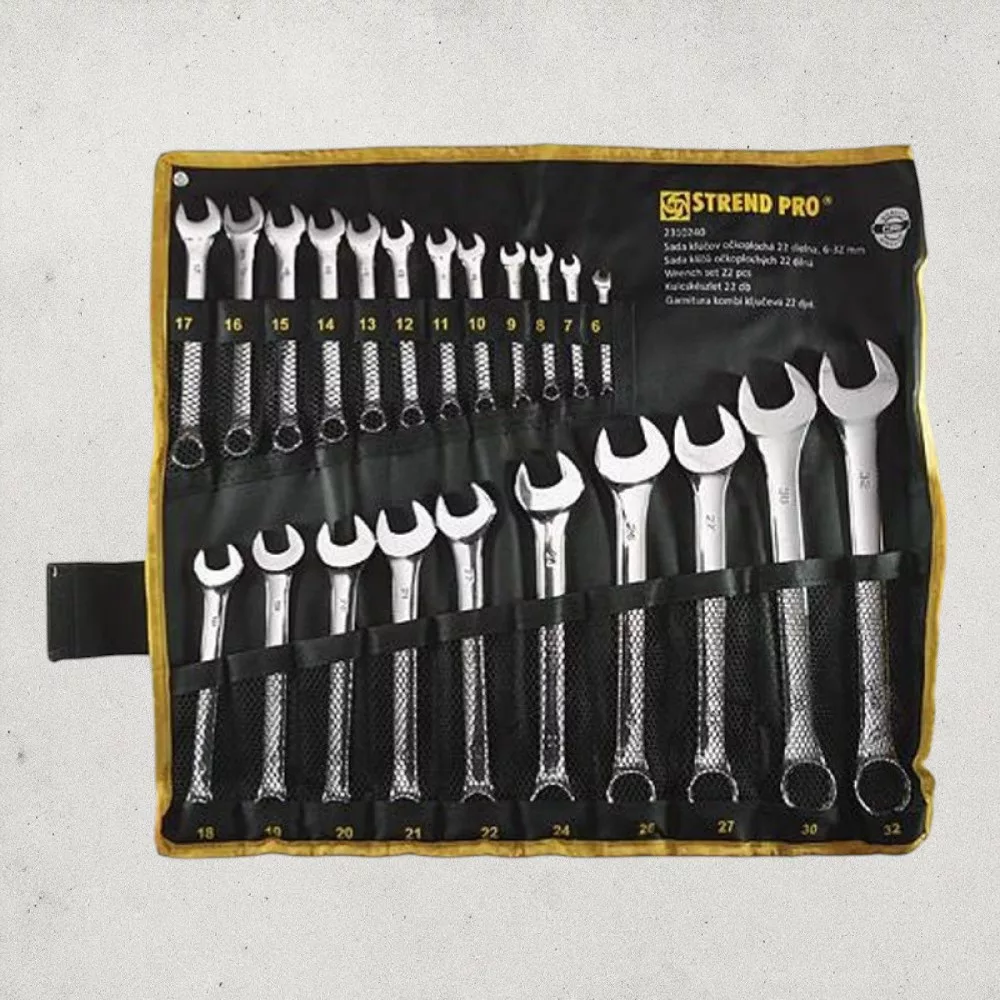 Érj el profi barkács eredményeket a Strend Pro HR31586 csillag-villás kulcs készlettel! A 22 darabos, 6–32 mm méretskálát lefedő készlet króm-vanádium acélból készült, így kiemelkedő szilárdságot és hosszú élettartamot garantál. A polírozott gyűrűvég 12 élű, precíz illeszkedéssel ad maximális nyomatékot, míg a nyitott villa gyors ráhelyezést tesz lehetővé. A csúszásgátló markolatmintázat kényelmes fogást biztosít, a tartós, feltekerhető vászon tok pedig rendezetten, biztonságban tartja a szerszámokat.