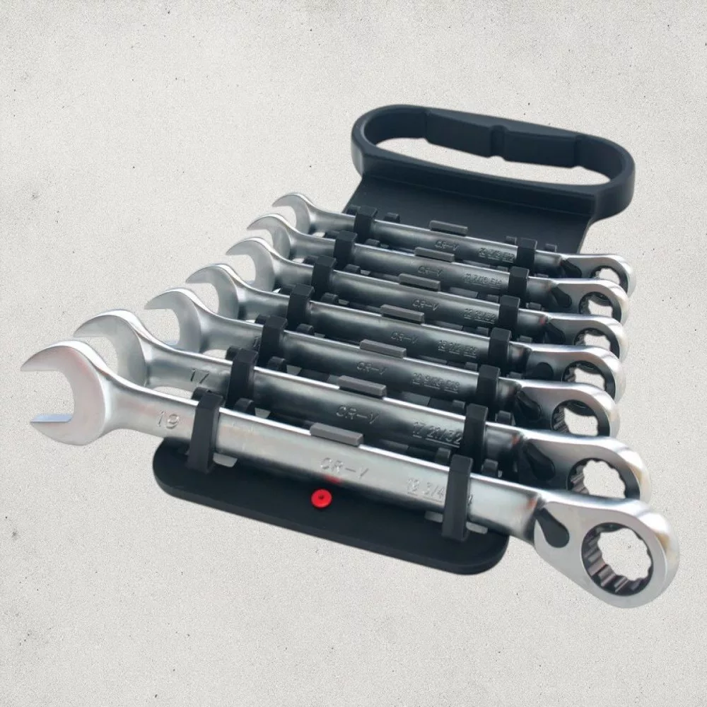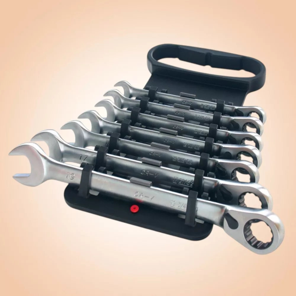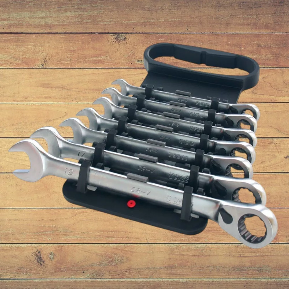 Gyorsabbá és kényelmesebbé teszi a csavarozást: a racsnis mechanika lerövidíti a munkaidőt, a hét kulcs pedig lefedi a legtöbb autó- és gépipari csavarfejet. A pontosan mart gyűrűprofil csökkenti a lekerekedés veszélyét, a króm-vanádium ötvözet pedig óvja a kulcsokat a kopástól. A praktikus tartóban minden méretnek saját helye van, így rendezett, átlátható marad a munkaterület, és mindig azonnal kézre esik a megfelelő kulcs.