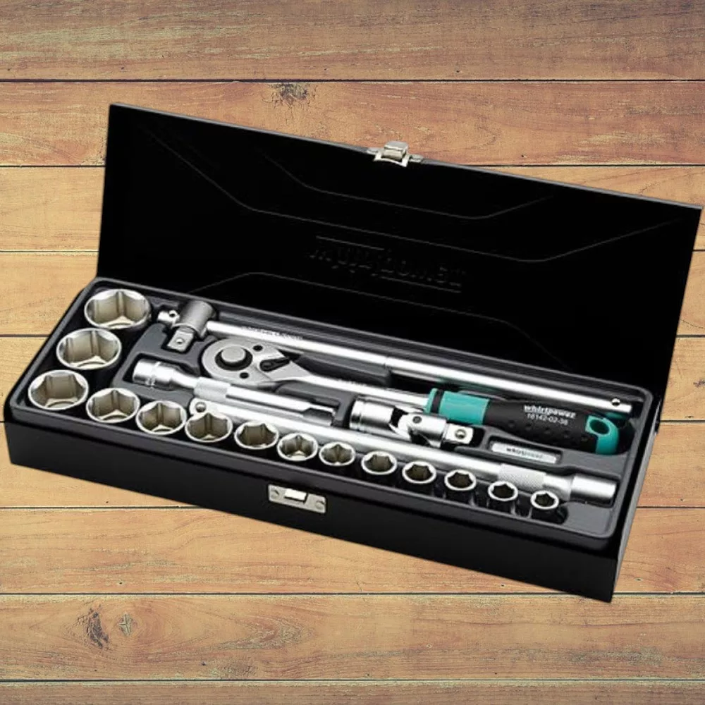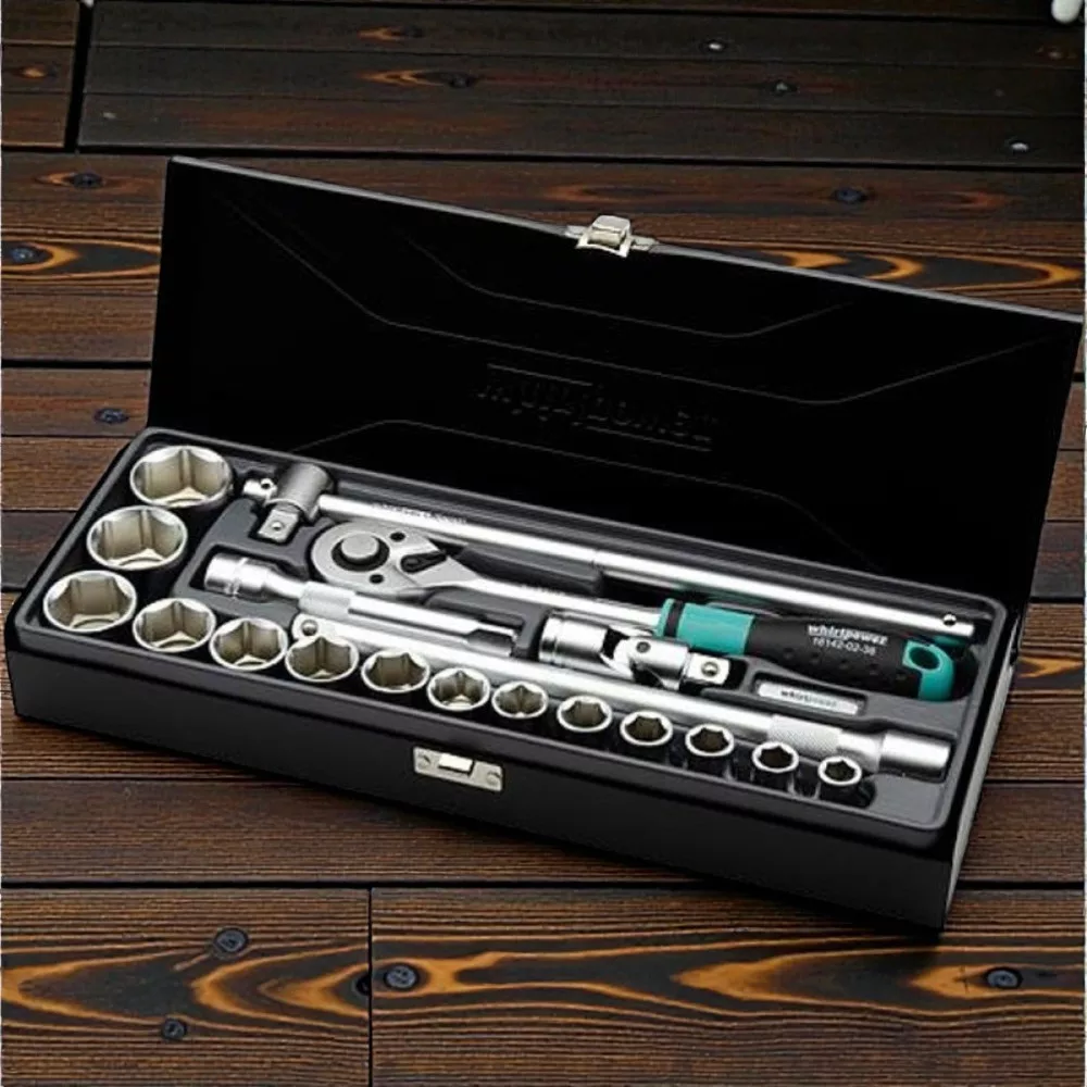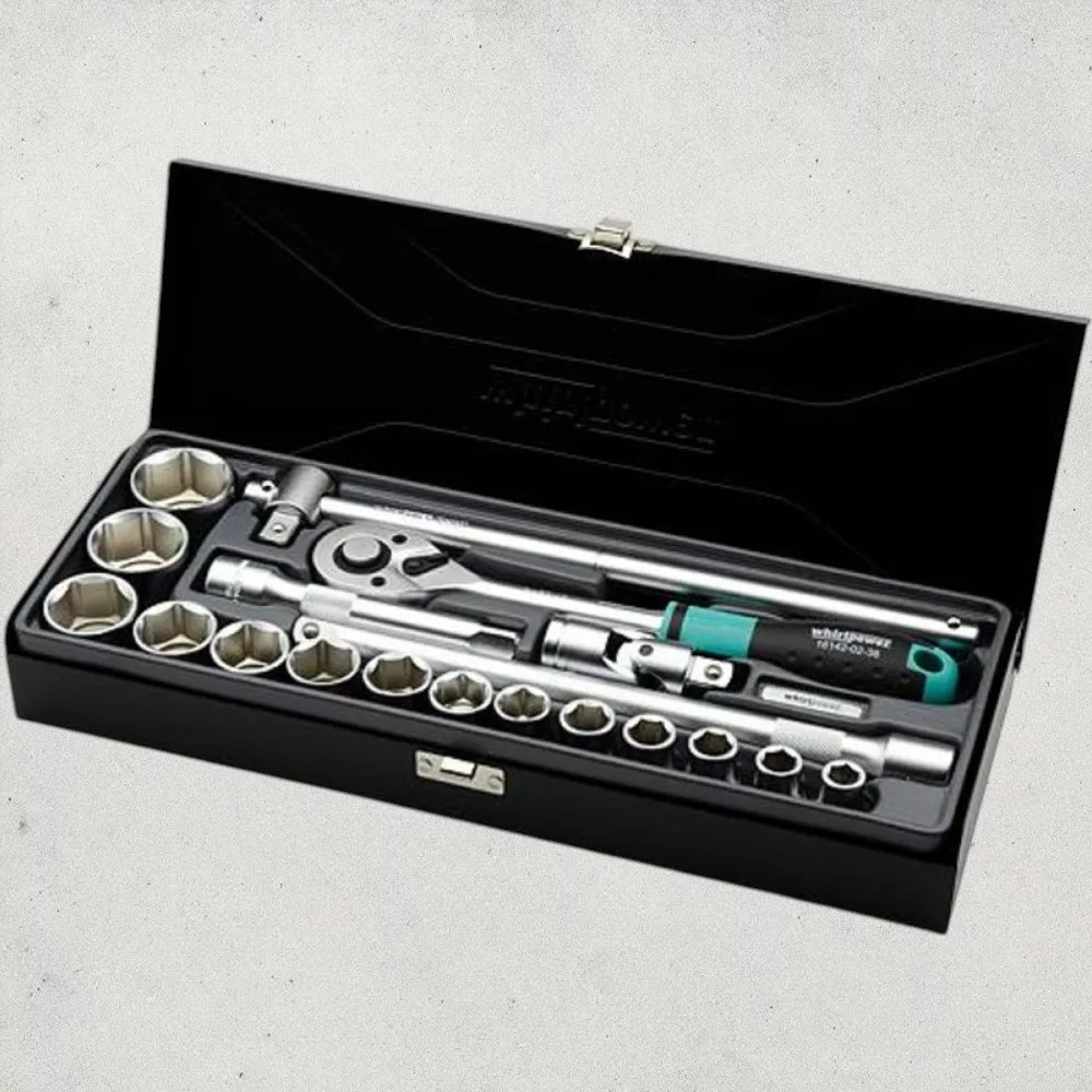 Legyen szó kerékcsere-segítségről, házi barkácsprojektről vagy profi szerelőmunkáról, a Dugókulcs készlet Whirlpower® 1614-SK13SE 1/2" hajtással minden helyzetben megbízható társad lesz. A masszív, fekete fémdoboz 45 gondosan válogatott elemet rejt: precízen esztergált dugókulcsfejeket, hosszabbítókat és racsnis hajtókart. A türkizzöld betétes markolat csúszásmentes fogást nyújt, a krómozott acélfelület pedig ellenáll a rozsdának és a kopásnak, így hosszú távon számíthatsz rá.