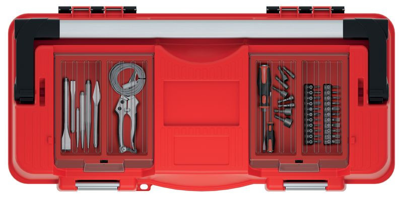 Egyszerre kínál nagy tárolókapacitást és átlátható rendszerezést, így a szerelési munkák közben nem veszítesz időt a keresgéléssel. A stabil, bordázott alj megakadályozza a doboz elcsúszását, a fém kapcsok pedig hosszú távon is megbízható záródást biztosítanak. A fedél alatti praktikus tálca külön helyet ad a gyakran használt bitfejeknek, mérőszalagoknak, így minden mozdulat hatékonyabbá válik.