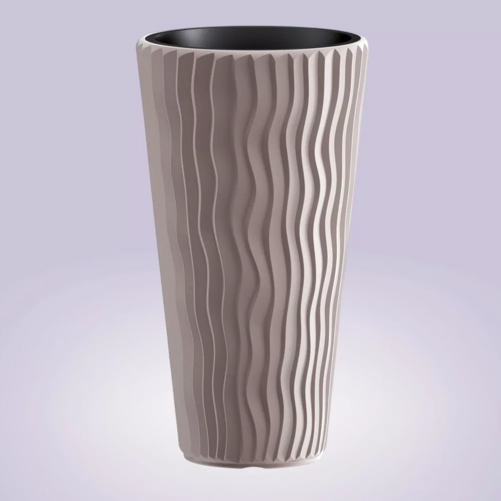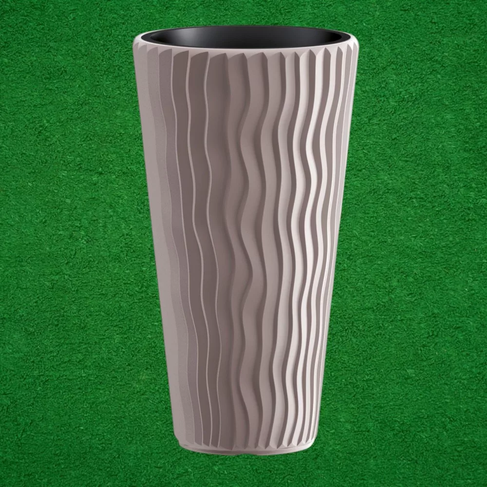 Az egyedi, hullámvonalas felület dinamizmust visz a környezetbe, mégis selymes tapintást nyújt, ami megkönnyíti a tisztítást. A mokka tónus harmonikusan kiemeli a lombozat friss zöldjét, beltéren és kültéren egyaránt. A betéttel kialakított rendszerrel kevesebb víz és tápanyag is elegendő, így gazdaságosabb a növénytartás, a gyökerek pedig optimális vízelvezetést kapnak.
