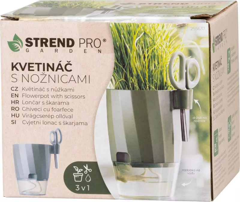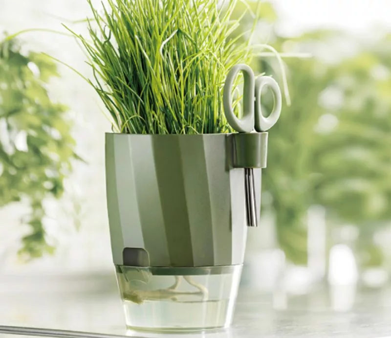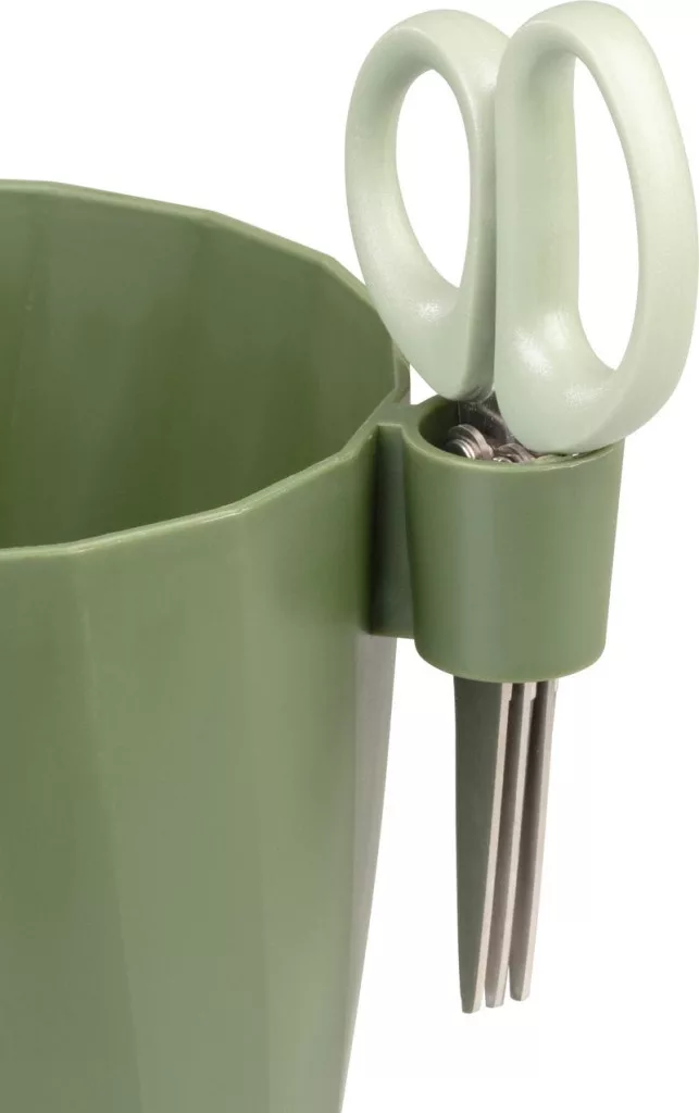 Ez a praktikus cserép egyszerre időt és helyet spórol: az oldalsó tartóban lévő rozsdamentes pengéjű metszőolló mindig kéznél van, így egyetlen mozdulattal levághatod a bazsalikomot vagy formázhatod a díszleveleket. A passzív önöntöző rendszer napokig biztosítja a megfelelő vízellátást, így akkor is friss marad a növény, ha elfoglalt napjaid vannak. A modern, matt zöld árnyalat otthonos, természetközeli hangulatot teremt a konyhában, nappaliban vagy erkélyen.