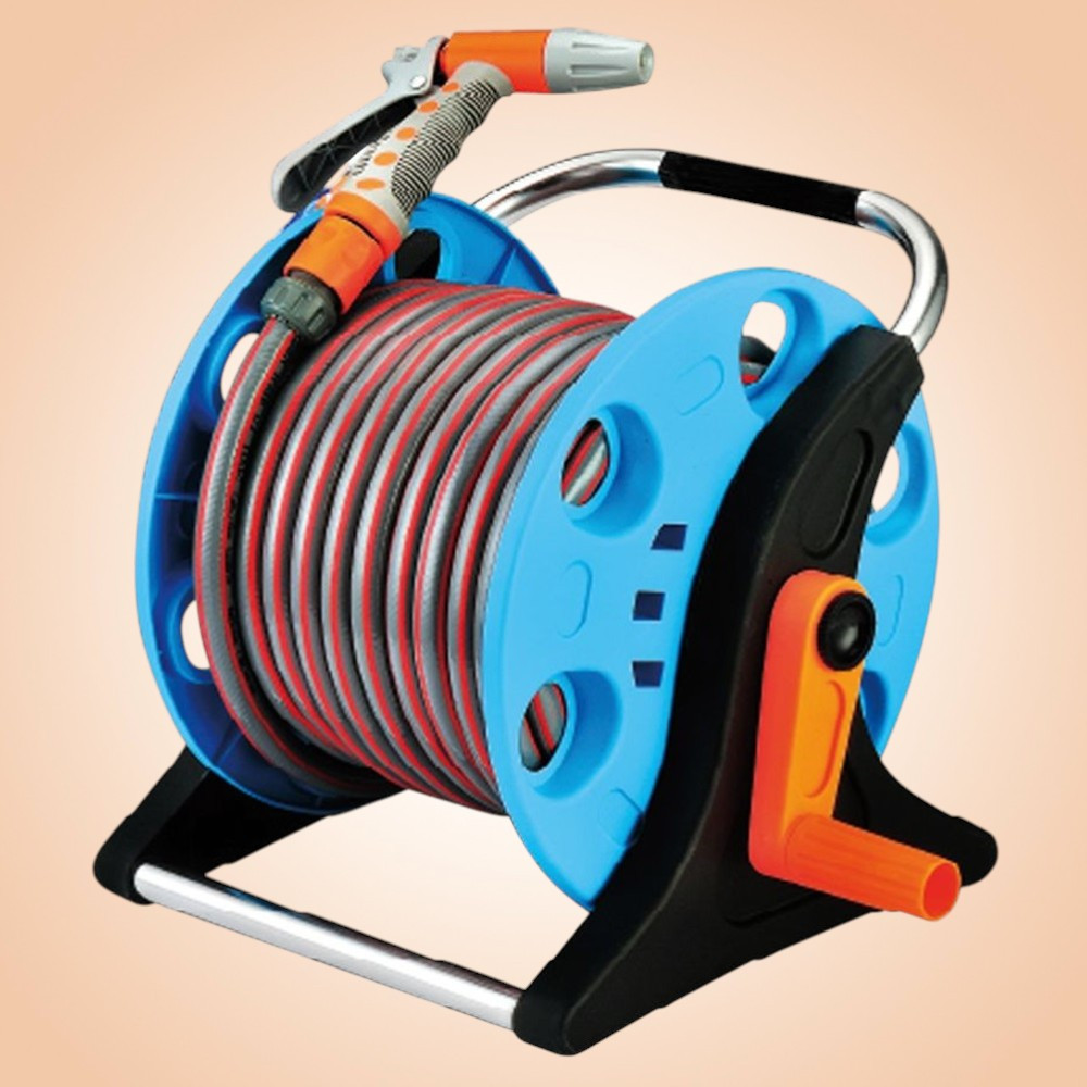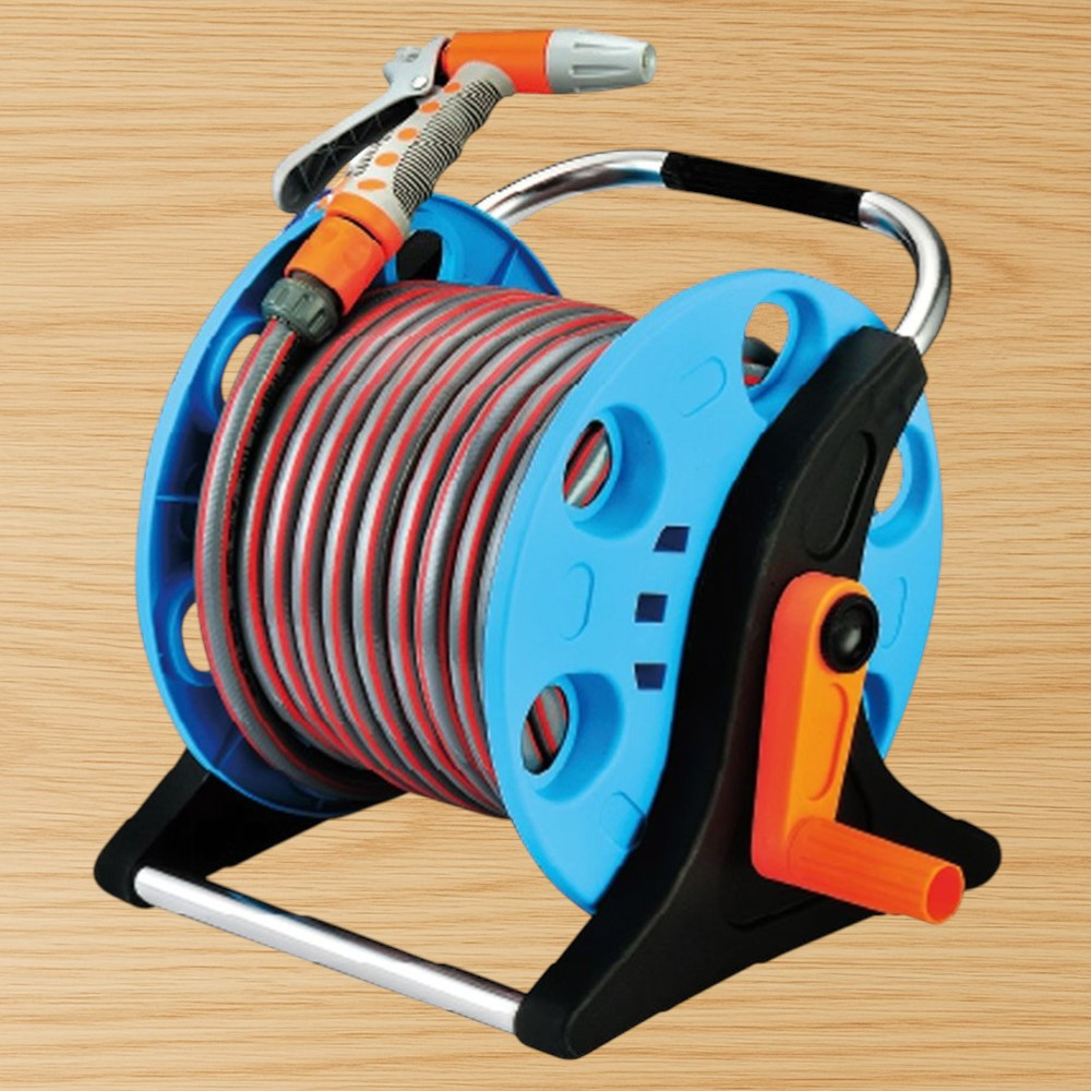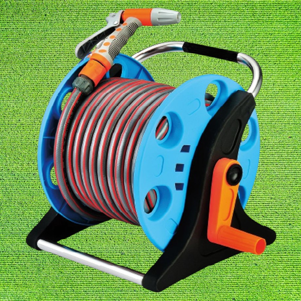 A Strend Pro Garden Tömlődob ST.2015A 20 méteres, 1/2"-os locsolótömlővel érkezik, hogy minden kerti öntözési feladatot kényelmessé és rendezetté tegyen. A stabil, fekete talppal és krómozott hordfogantyúval ellátott, kék oldallapokkal díszített dob egyszerűen hordozható, mégis masszívan áll a földön. A narancssárga forgatókarral pillanatok alatt feltekerheted a tömlőt, a szórópisztoly pedig finom permettől erős sugárig állítható, így a palántáktól a bokrokig mindent elérsz.