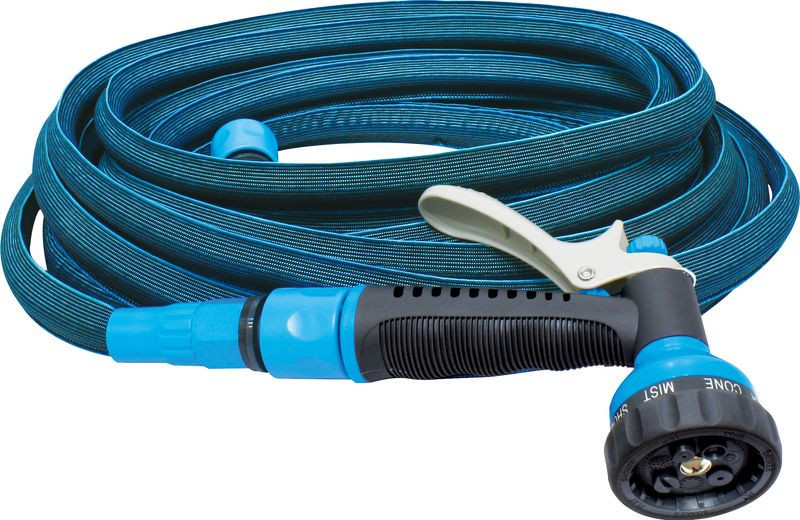 Kerti locsolótömlő, Aquacraft 870020, kék, 1/2", 10–20 m, 6 bar, flexibilis, nyújtható, 7 funkciós szórópisztollyal, csatlakozókkal, PVC belső cső, textilborítás