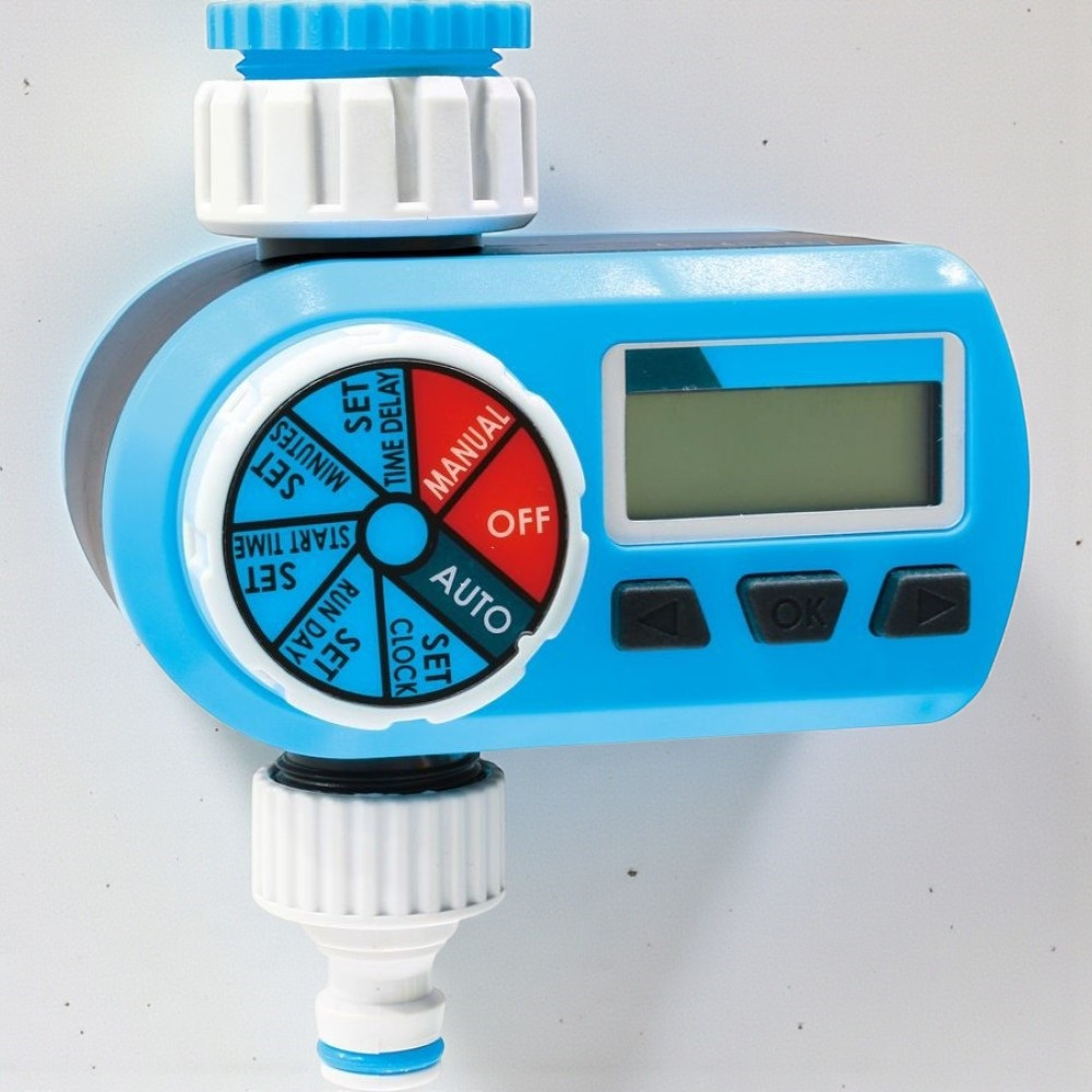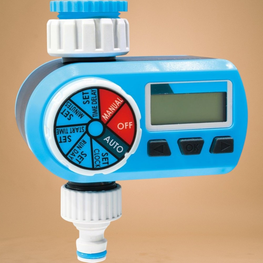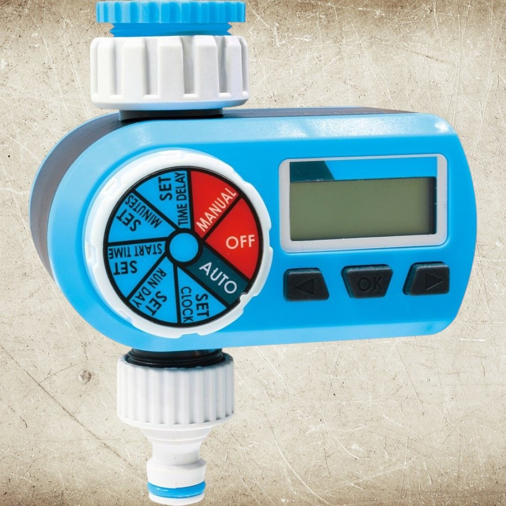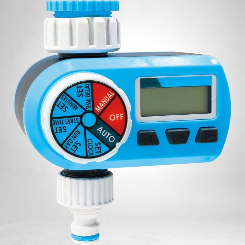 Vedd át az irányítást kerted öntözése felett az AQUACRAFT® 290140 digitális időzítővel! A könnyű, 0,36 kg-os eszköz 1” vagy 3/4” menetes csapra is felcsavarható, a golyóscsap pedig szivárgásmentes vízáramot garantál. A nagyméretű LCD kijelző és a színes programtárcsa gyors, intuitív beállítást tesz lehetővé: napi egy vagy két indítás, akár többnapos ütemezéssel. Egyetlen kimenetével pontosan adagolja a vizet csepegtetőkhöz, mikroszórókhoz vagy esőztetőkhöz, a működésről pedig két darab AA elem gondoskodik.