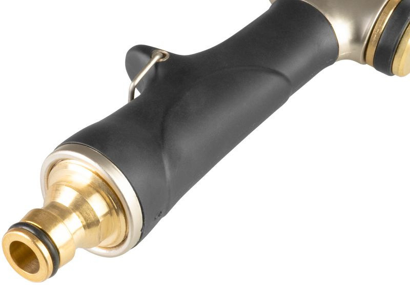 A kerti locsolópiszoly Strend Pro Garden BJ4037T erős cink- és sárgaréz testtel készül, ezért strapabíró társ a mindennapi locsoláshoz. Forgatható fejével nyolc különböző vízformát alakíthatsz ki, a lágy permettől a határozott sugárig, így minden feladathoz megtalálod az ideális vízáramot. Ergonomikus, csúszásmentes markolata kényelmes fogást ad száraz és nedves tenyérben is. A 20 × 12,8 × 6 cm-es méret és a mindössze 0,42 kg-os tömeg gondtalan, fáradságmentes használatot biztosít.