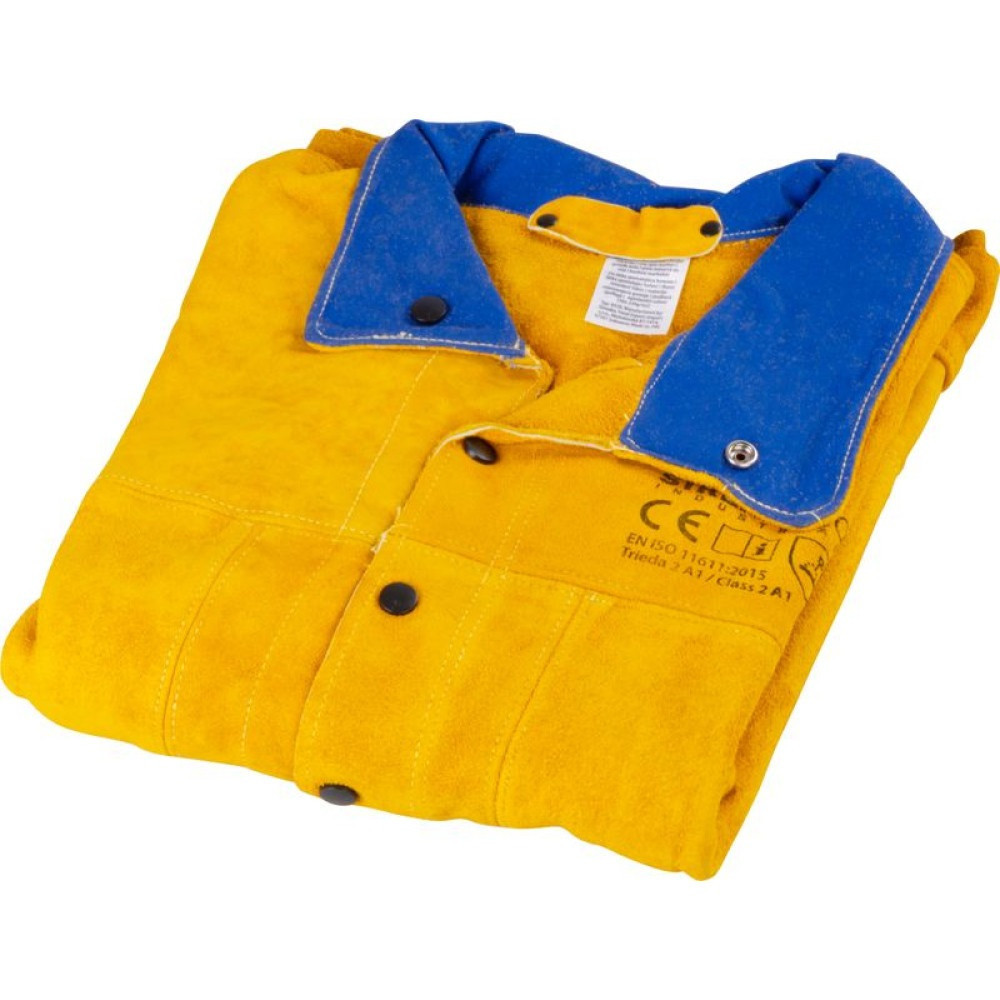 Ez a kabát a 2. védelmi osztályba tartozik, ezért ideális erős fröccsenéssel járó kézi ívhegesztéshez, MAG/MIG eljáráshoz vagy plazmavágáshoz. A masszív bőr megfogja a forró szikrákat, miközben a gombos zárás gyors fel- és levételt tesz lehetővé. A jól látható sárga szín és a kontrasztos kék gallér egyaránt praktikus és stílusos, hogy a műhelyben is magabiztosan dolgozhass.