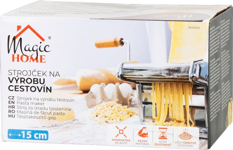 Friss, autentikus tésztaillatot szeretnél otthon érezni? A MagicHome tésztagép 21,5 × 21 × 14,5 cm-es, masszív szénacél testével pillanatok alatt lisztből és tojásból ruganyos spagettit, tagliatellét vagy lasagnelapot varázsol. A három beépített vágóhenger segítségével 2–6 mm között állíthatod a vastagságot, a 15 cm-es maximális szélesség pedig bőséges helyet kínál a nagyobb lapoknak. Krómozott, INOX bevonata elegáns, ugyanakkor rozsdamentes és strapabíró, így évekig hű társad lesz a konyhában.
