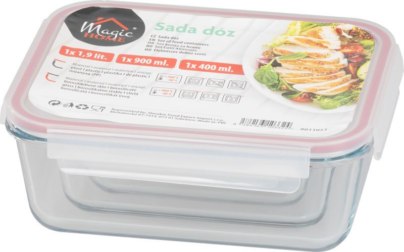 Tárolódoboz szett, MagicHome, átlátszó, 3 db, 400/900/1900 ml, téglalap alakú, fedéllel, hermetikusan záródó, mosogatógépben mosható