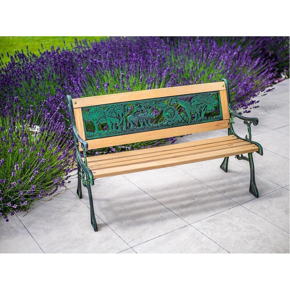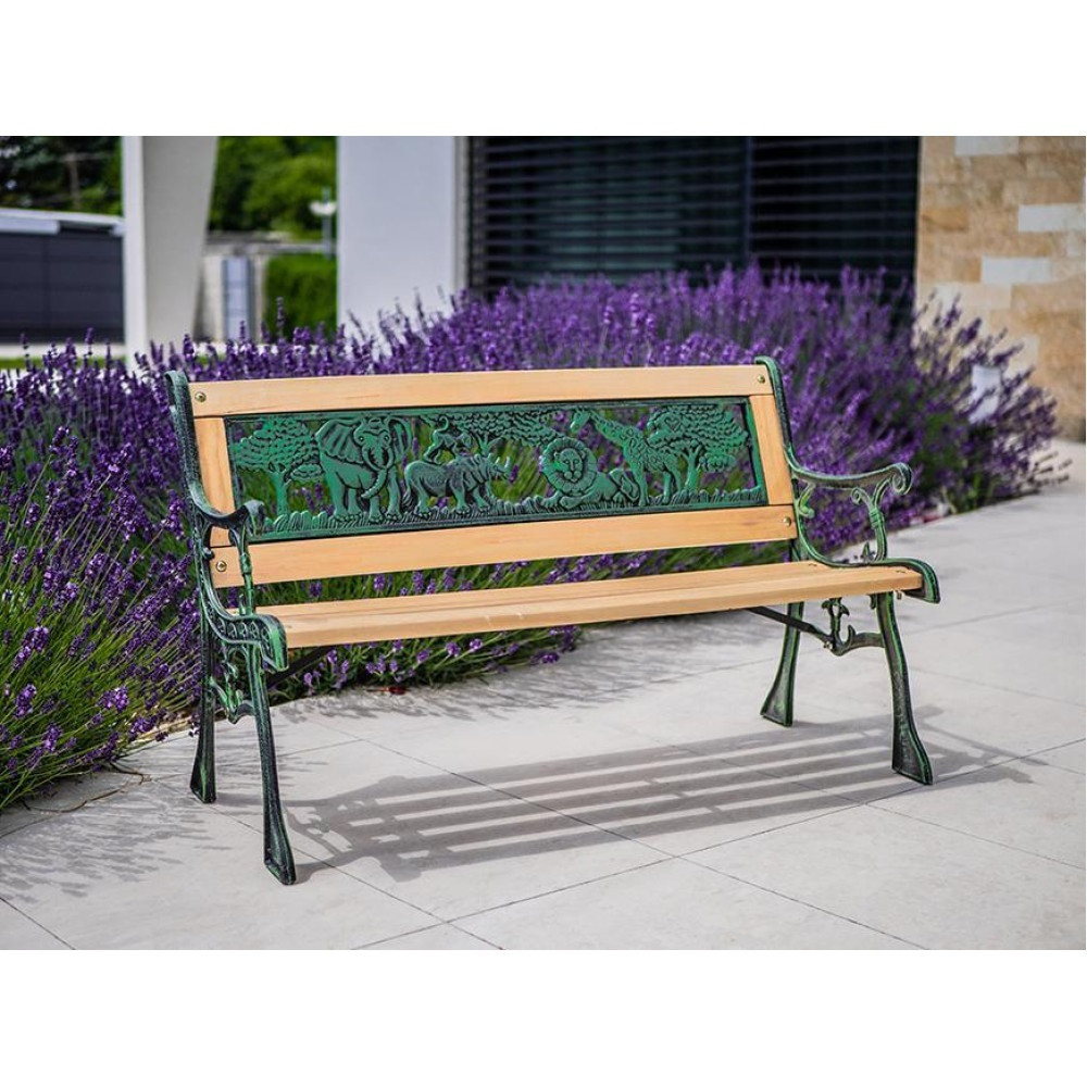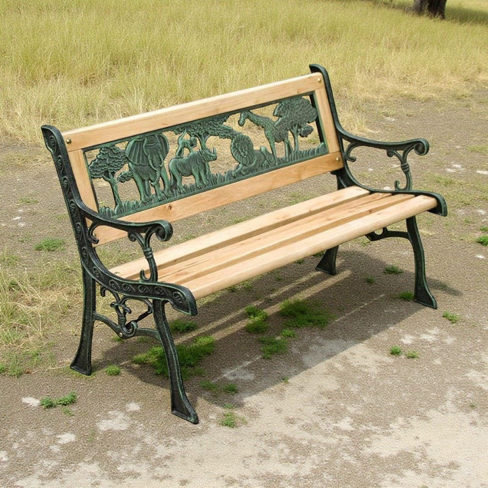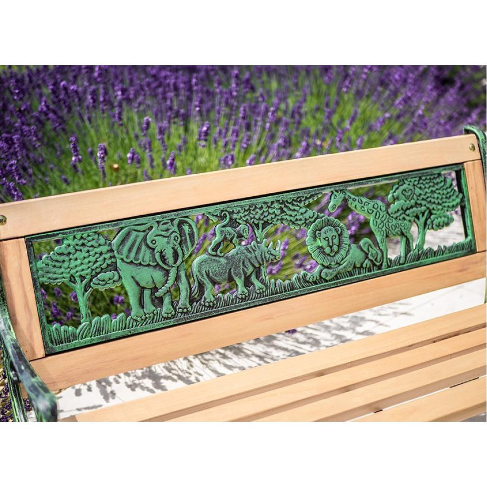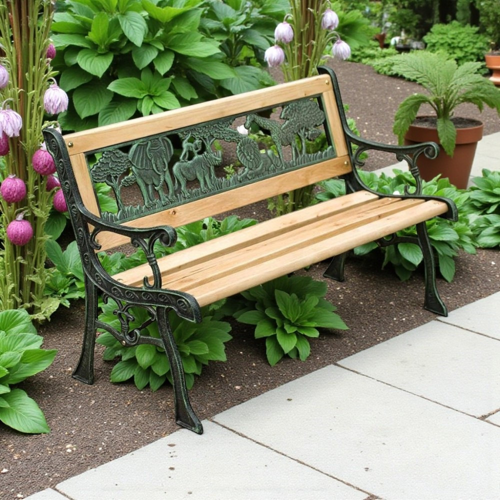 A MINI JUMANJI pad nemcsak praktikus, de igazi dísze is a kertnek. Erős fémszerkezete stabilitást biztosít, míg a fa ülőlap kényelmes és időtálló. Az öntöttvas háttámlát díszítő állatmotívumok – például zsiráf, oroszlán és elefánt – játékos, vidám hangulatot kölcsönöznek, így a gyerekek számára is kedves pihenőhelyet teremt. Könnyen mozgatható, karbantartást alig igényel.