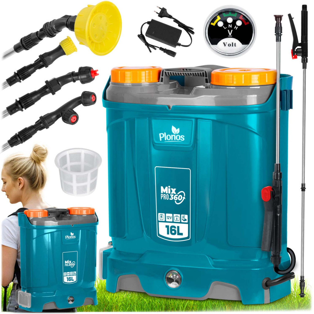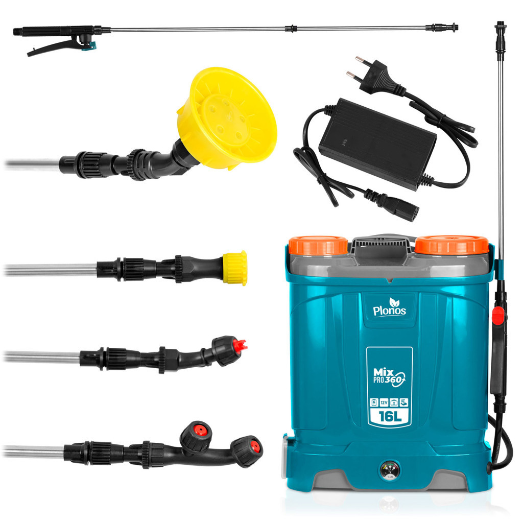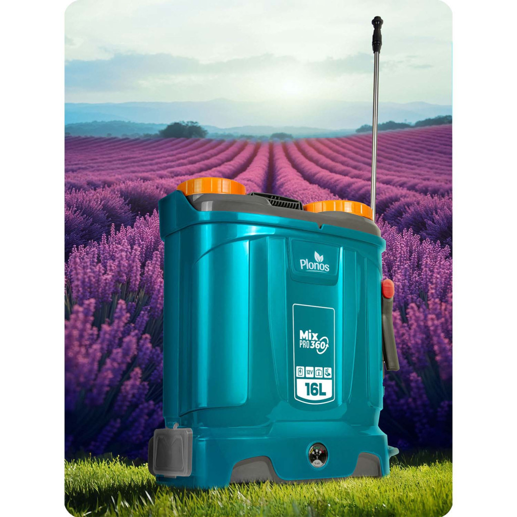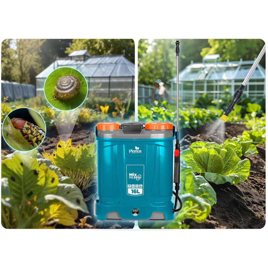 Az Plonos PL-604 akkumulátoros háti permetező egyetlen töltéssel 16 literes tartályából egyenletes, finom permetet biztosít. A Mix Pro 360 beépített keverő folyamatosan mozgásban tartja a folyadékot, így a hatóanyag nem ülepszik le. A mindössze 6,3 kg-os készülék puha, állítható vállpántokkal simul a hátadra, ergonomikus formája kíméli a derekat. A teleszkópos szórókar és a többféle fúvóka révén pontosan szabályozhatod a szórási mintát és az átfolyást, így minden növény a szükséges mennyiséget kapja.