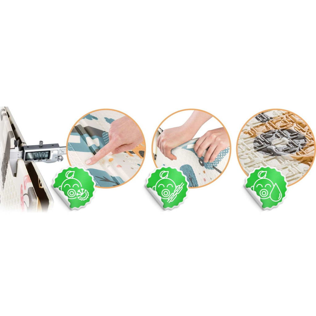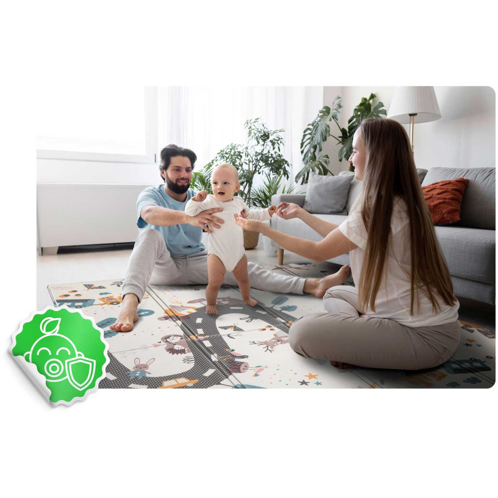 Ez a sokoldalú szőnyeg puhán tompítja az eséseket, vastag habrétege hatékonyan szigeteli a hideg padlót, ezért a baba kényelmesen gyakorolhat kúszni, ülni, járni. A csúszásgátló felület megelőzi a megcsúszást, a rugalmas XPE hab nem szakad és nem morzsolódik. BPA-, PVC-, ftalát- és formamid-mentes anyaga kíméli az érzékeny bőrt, ráadásul nem gyűjti a port, így allergiás gyerekeknek is ideális. A prémium kidolgozás és a CE, EN71 tanúsítvány garantálja, hogy a szőnyeg éveken át megbízható, színes játszófelület marad.