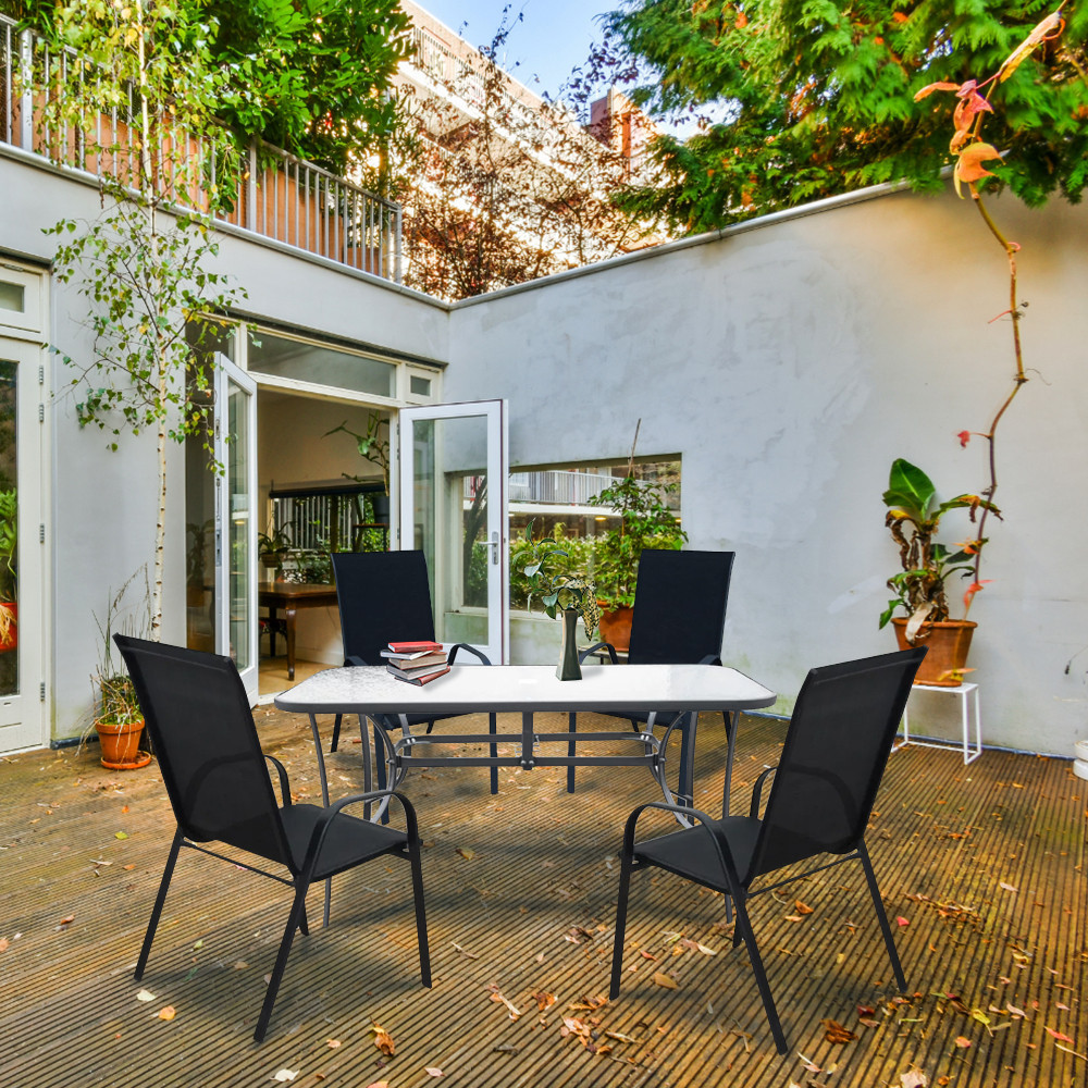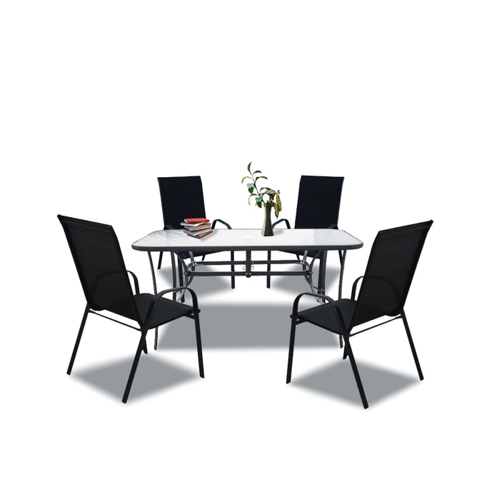 A modern kivitelű kerti bútorkészlet egy kerti üveglapos asztalt és 4 széket tartalmaz. A székek rteherbírása 120 kg. A bútorokat 4 fő számára tervezték. A székek és az asztal lábazata fémből készül. Az asztallap 5 mm-es edzett üvegből készült, amely ellenáll a kisebb karcolásoknak. Az textilén szék ülésanyaga ellenáll az időjárási viszonyoknak. Előnye az ergonómikusan profilált ülés és karfa, amelyek tehermentesítik a vállakat pihenés közben.