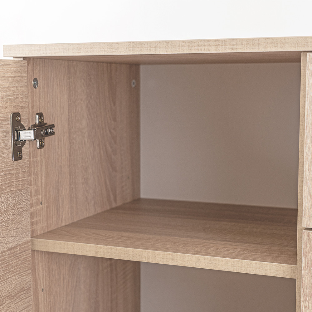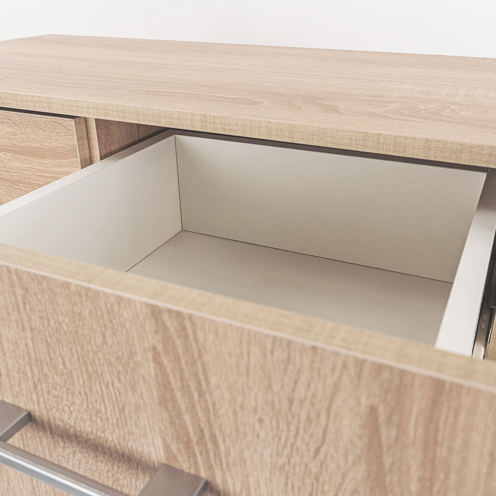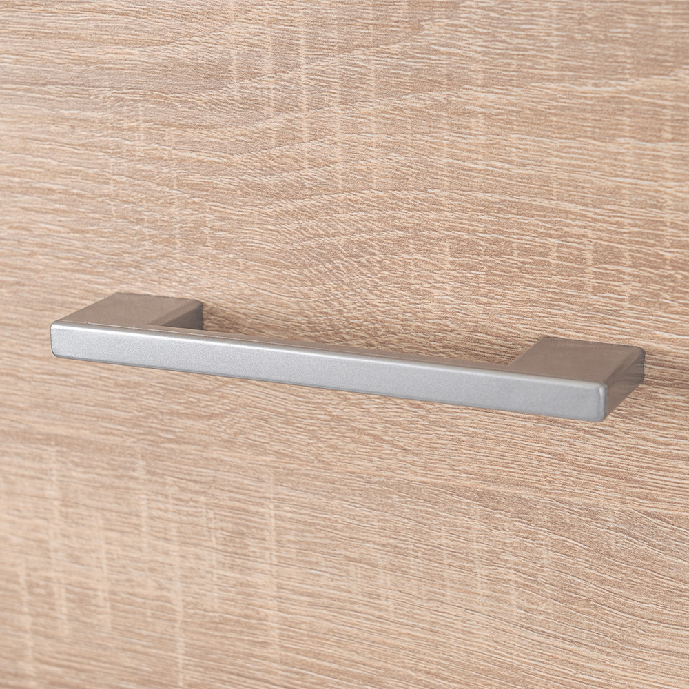 A Miami komód sonoma tölgy fronttal és a sonoma tölgy korpusszal letisztultságot és eleganciát kölcsönöz a térnek, miközben a minőségi bútorlap anyaga garantálja a tartósságot és az ellenálló képességet. Méretei - 40 cm mélység, 80 cm szélesség, 92 cm magasság - ideálisak bármely helyiségbe. A komód A komód 1 nyílóajtaja mögött 3 polc található, emellett további 4 görgős fiókkal lett kialakítva, amelyek tökéletesen alkalmasak ruhák, könyvek vagy akár irodai felszerelések tárolására. A modern dizájnt matt króm hatású műanyag fogantyúk egészítik ki, amelyek még letisztultabbá teszik a megjelenést.