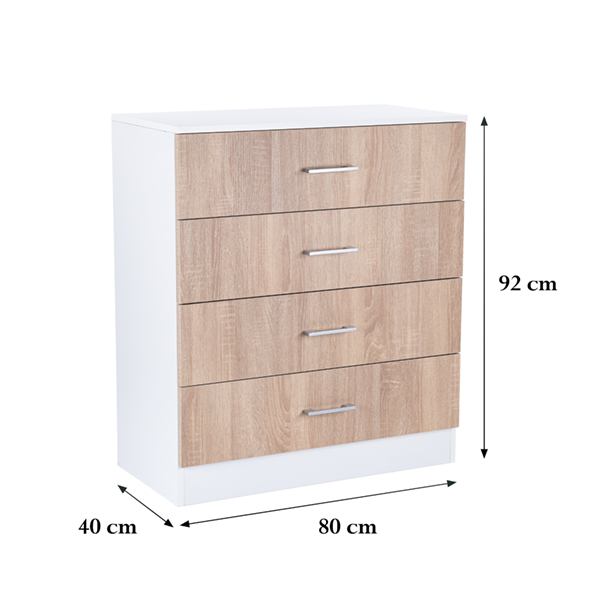 A Miami komód sonoma tölgy fronttal és a fehér korpusszal tisztaságot és eleganciát kölcsönöz a térnek, miközben a minőségi bútorlap anyaga garantálja a tartósságot és az ellenálló képességet. Méretei - 40 cm mélység, 80 cm szélesség, 92 cm magasság - ideálisak bármely helyiségbe. A komód 4 görgős fiókkal lett kialakítva, amelyek tökéletesen alkalmasak ruhák, könyvek vagy akár irodai felszerelések tárolására. A modern dizájnt matt króm hatású műanyag fogantyúk egészítik ki, amelyek még letisztultabbá teszik a megjelenést.