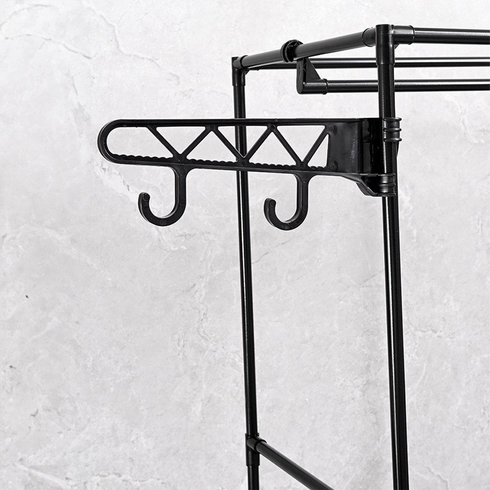 - Megnövelt funkcionalitás: A dupla akasztók mellett az állvány további polcokkal és fogantyúkkal rendelkezik, amelyek tovább növelik a funkcionalitást és lehetővé teszik a különböző tárgyak rendszerezését.
