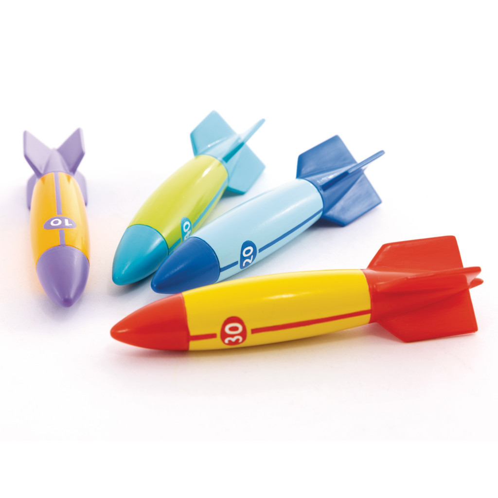 Dobd fel a medencés játékokat ezekkel a víz alatti torpedókkal, amelyek látványosan siklanak a víz alatt. A 3 × 3 × 12 cm-es torpedók élénk színekben készülnek, így könnyen észrevehetők merülés közben. Puha, rugalmas külső borításuk biztonságos használatot garantál, míg a kemény középső markolat pontos indítást tesz lehetővé. Akár 6 méter mélyen is stabilan haladnak a vízben.